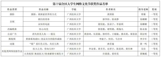 近日,自治区教育厅公布第十届全区大学生网络文化节获奖名单,由学生工作部(处)牵头组织学生申报的作品表现优异,共9项作品获奖,其中一等奖4项、二等奖2项、三等奖3项,获奖类别覆盖音频、摄影、其他类网络创新作品等多个领域,充分展现医大学子的网络文化创新能力。