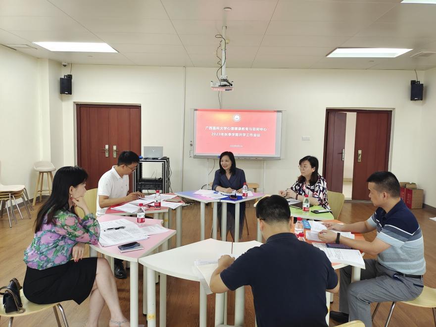 2023年9月1日上午9:00,心理健康教育与咨询中心在校本部科技楼六楼626室召开2023年秋季学期开学工作会议。心理中心主任闵晓阳,副主任、校本部分中心张瑜,武鸣校区分中心主任杨勇,玉林校区分中心主任赵婷婷出席会议及中心全体专职教师参会。