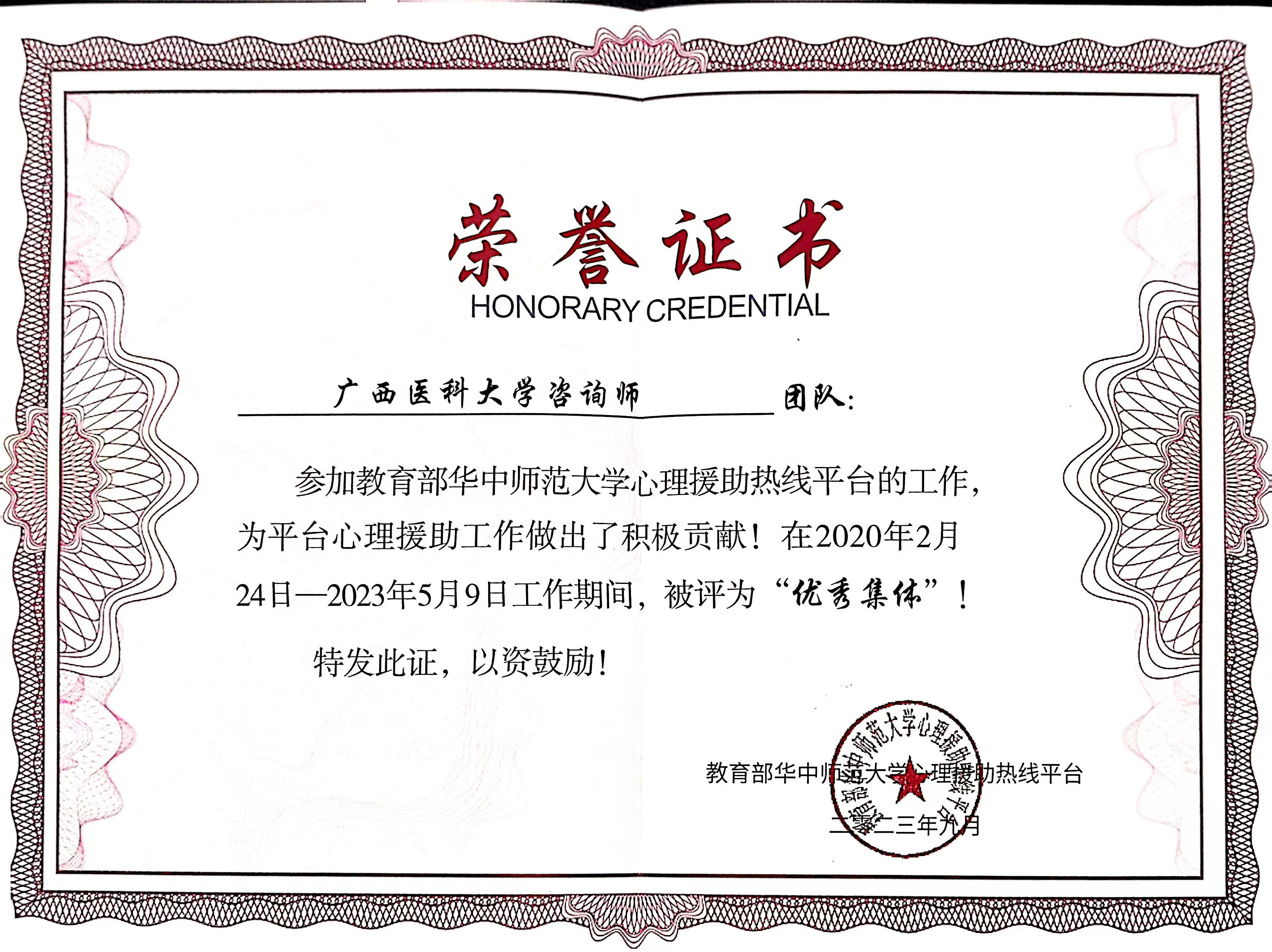 近日,教育部华中师范大学心理援助热线平台第一阶段至第九阶段优秀奖评选结果公布,我校荣获“优秀集体”称号。