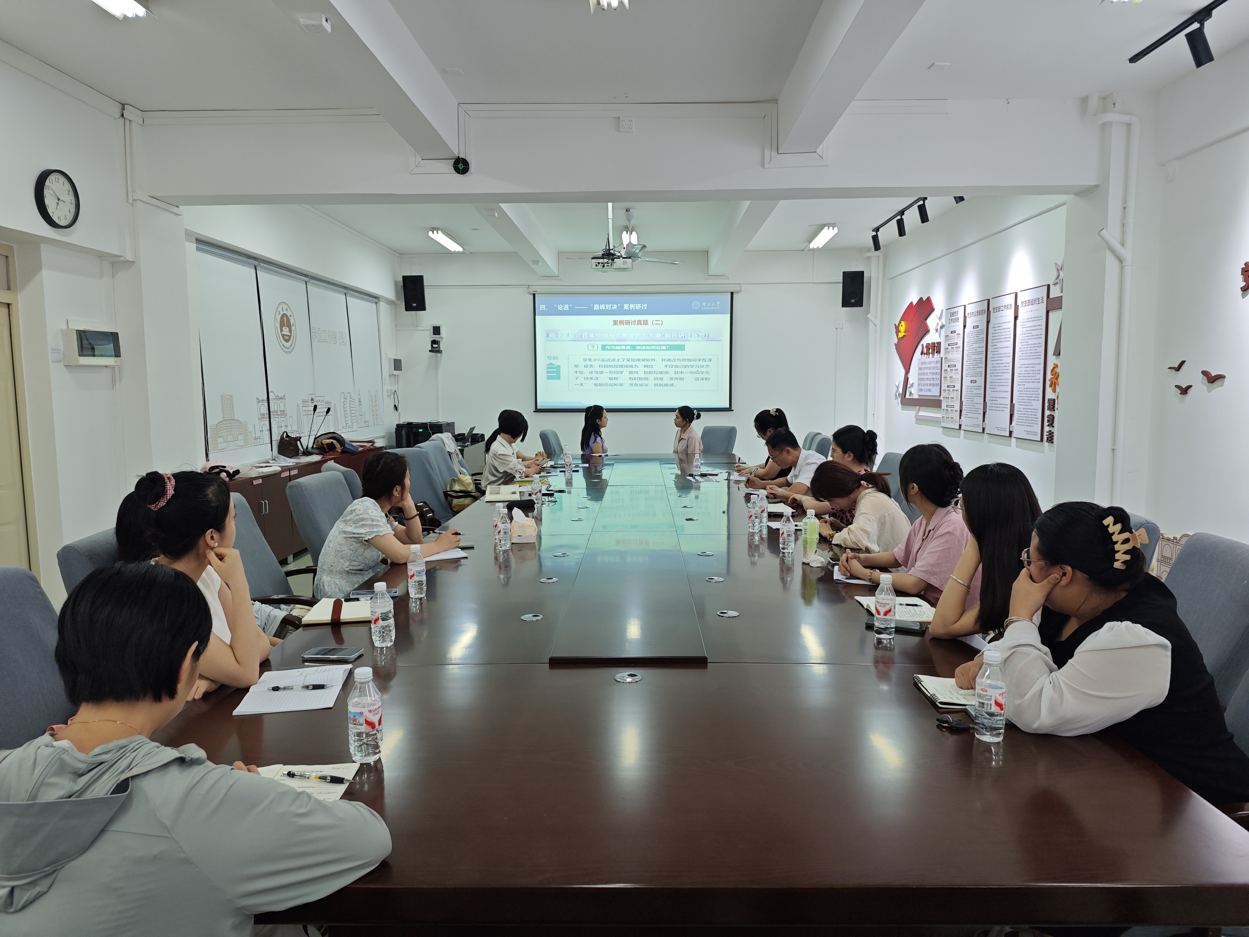 本期活动邀请了第十三届区赛特等奖获得者,来自广西大学的辅导员孙晓黎老师实战指导。孙老师紧扣区赛比赛规则,深入剖析了案例研讨和谈心谈话环节的破题要点与回答策略。在实战演练环节,孙老师全面细致指导两位区赛选手就区赛真题进行模拟演练,并针对选手们的具体表现进行了点评和指导,为两位选手更好地掌握大赛备考指明了方向。与会辅导员也积极讨论交流分享,现场氛围热烈。