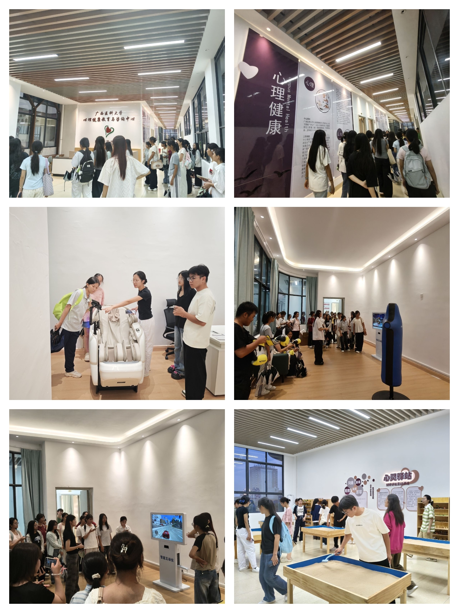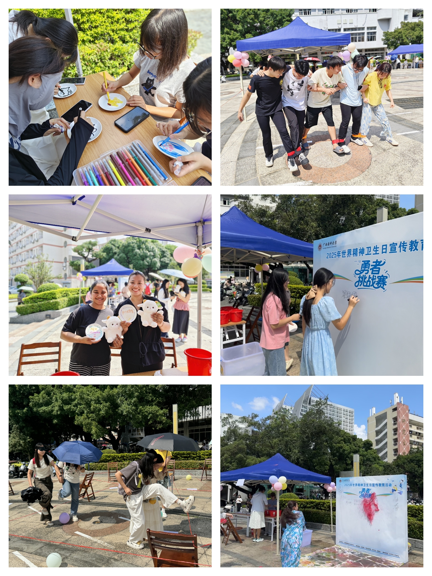各校区结合学生特点,推出了形式多样的现场活动。武鸣校区举办了线下宣传,通过“快问快答”普及心理知识,“情绪窗口”绘画表达内心,“心晴市集”角色互动传递理解与鼓励;当晚还举行心理健康主题直播,由心理中心教师联合附属武鸣医院心理卫生专家在线解答大学生常见心理困惑、介绍校园心理服务与专业心理支持途径。校本部活动聚焦于体验与释放,“勇者挑战赛”让同学通过扔水球实现物理宣泄,“情绪心理大冒险”融合心理问答与体力挑战,“心灵盲道·信任之旅”则通过蒙眼引导,增强了同学间的信任与感知力。玉林校区举行心理中心体验日活动,同学们通过参观功能室、亲身体验沙盘、音乐放松等项目,深入了解了学校提供的专业心理成长支持资源。后续,心理中心还将持续开展吉祥物设计、心理健康知识竞赛、陶艺与手工疗愈等活动。